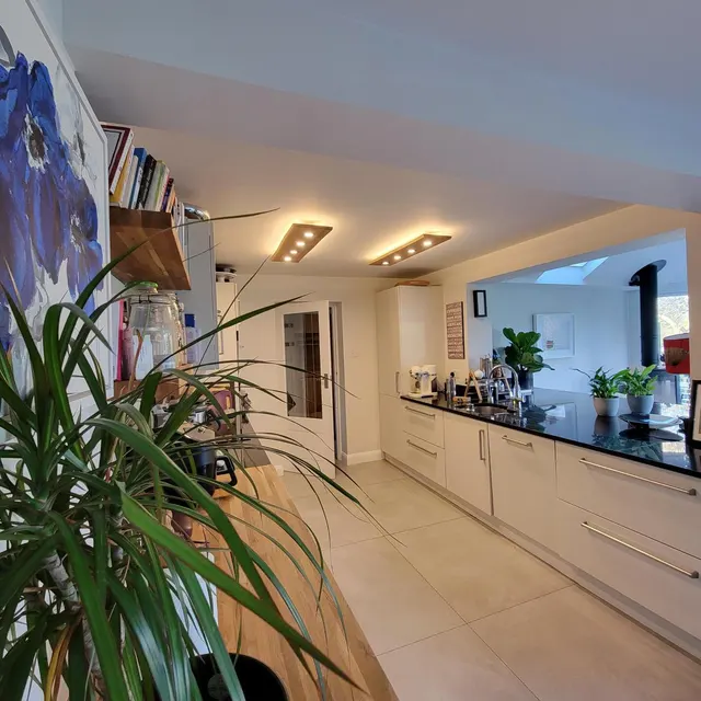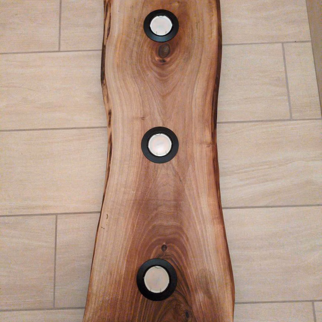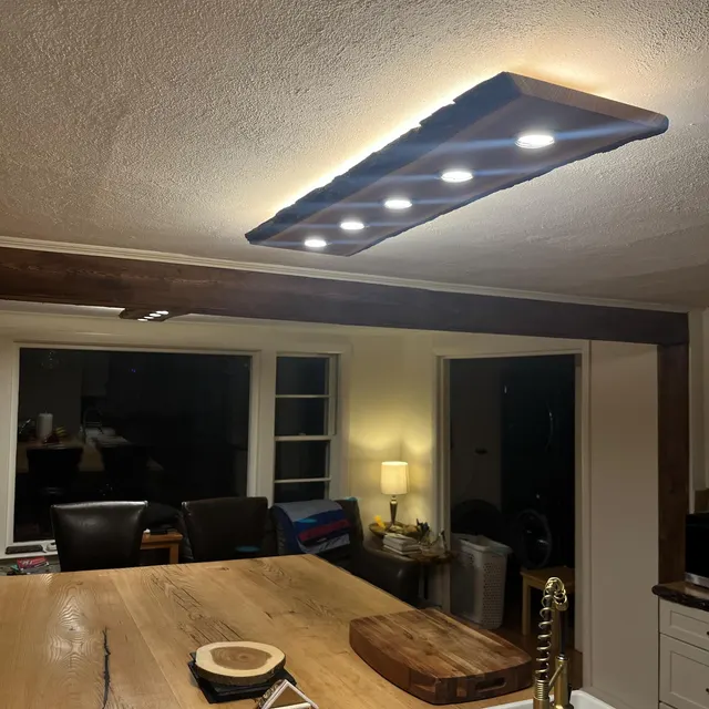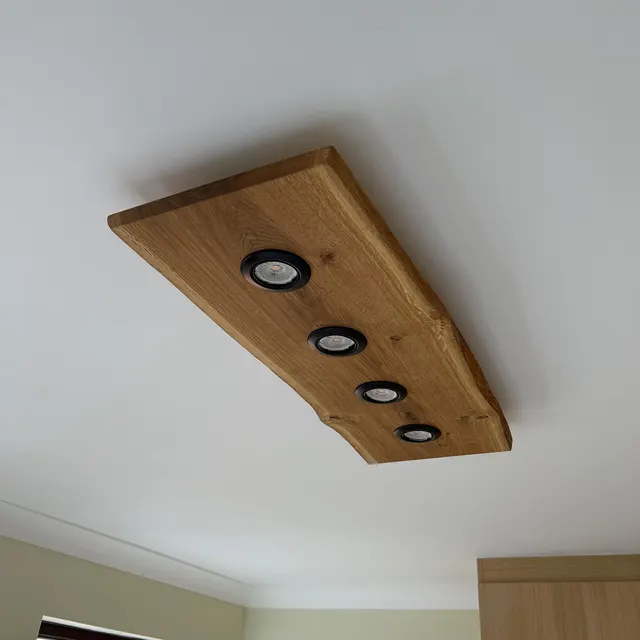 Gre za leseno stropno svetilko z naravnim robom (live edge), ki vključuje integrirano LED ambientalno osvetlitev in direktne reflektorje.